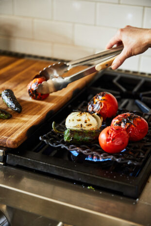 This is the salsa I make in big batches because it disappears quickly. A few things to keep in mind: after you have made the salsa, try and let it sit for 30 minutes before serving so the flavors can mingle. If your jalapeños are really mild, consider adding one serrano per two jalapeños—you’ll get a nice pepper flavor along with the kick from the serrano. I add a variety of tomatoes to my salsas for consistency and flavor; without the variety, the sauce becomes either too runny (if using only vine-ripe) or too coagulated (if using only plum tomatoes).